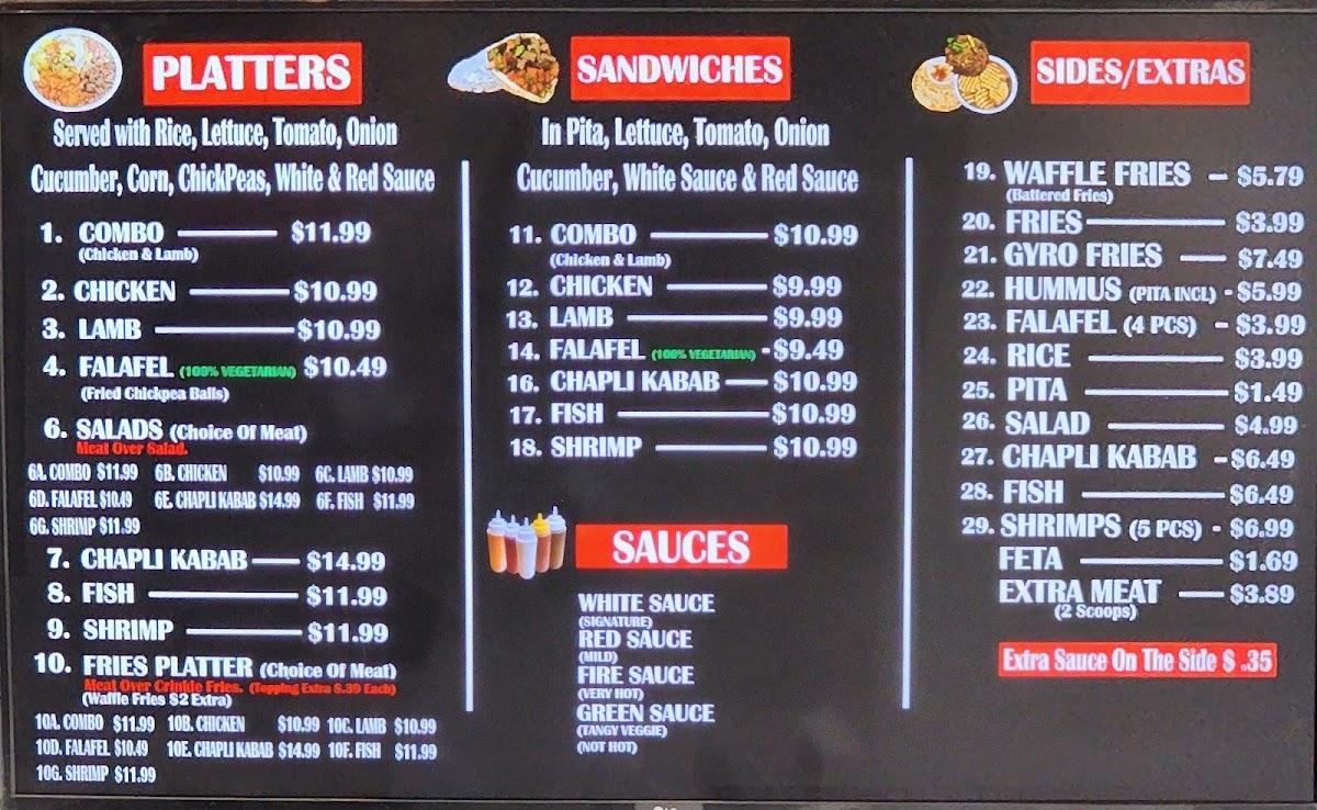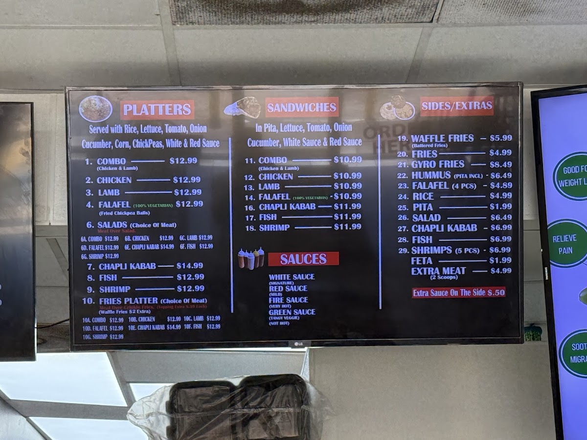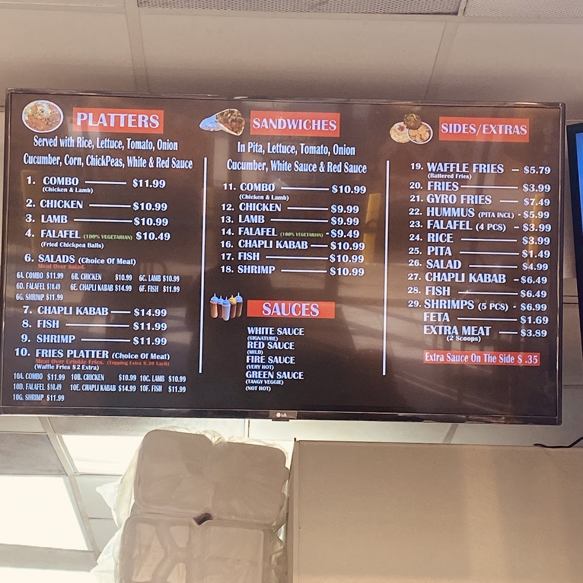 Grilled Chicken & Lamb Gyro On top of Crinkle Cut Fries served with Our Signature White Sauce & Hot Sauce.