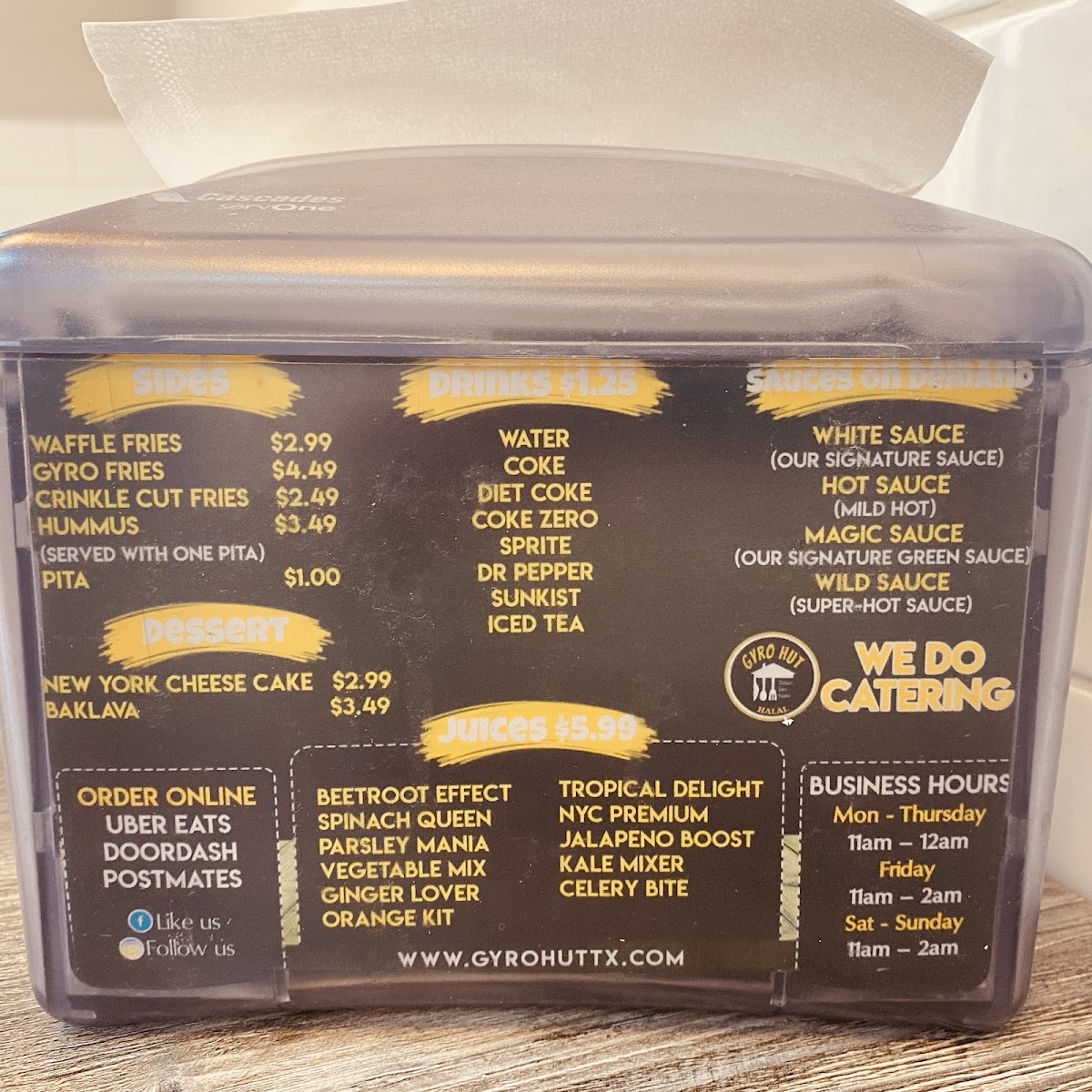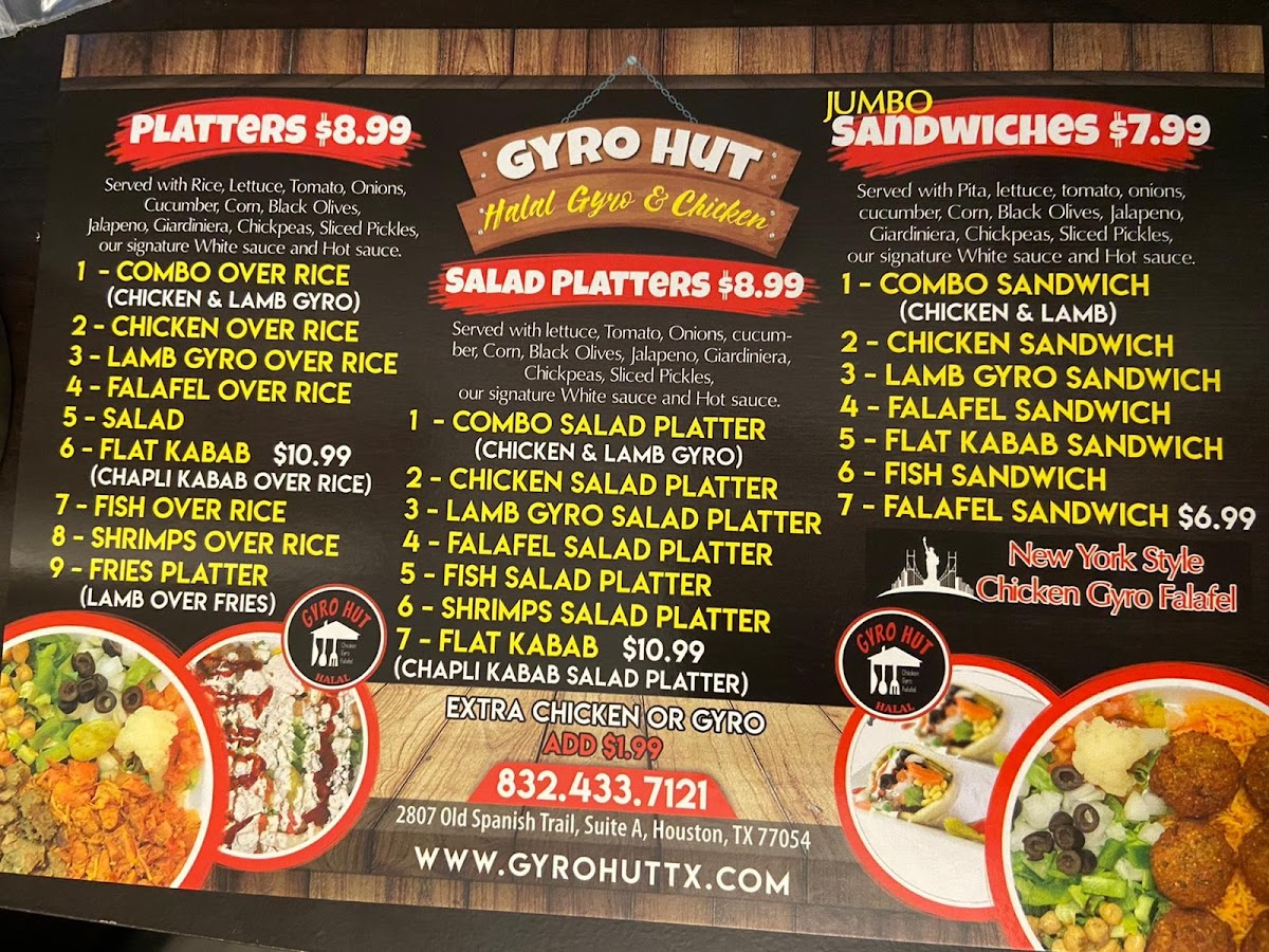 Lamb Gyro Served in Pita, Romaine Lettuce, Cucumber, Onions, Tomatoes, Chickpeas, Jalapenos, Pickles, Olives, Corn, Giardiniera, Our signature White Sauce and Hot Sauce.